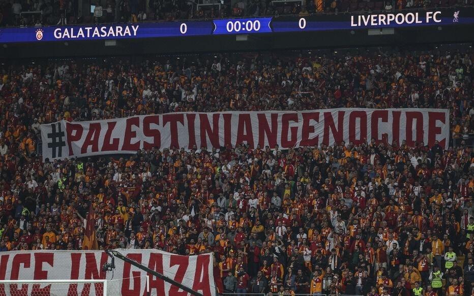 加拉塔萨雷球迷在对阵利物浦时,打出了支持巴勒斯坦的标语