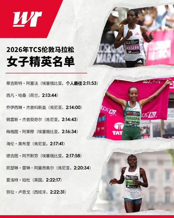 总的来说,2026年伦敦马拉松的阵容包括了2025年八大雅培世界马拉松大满贯赛事中四站的卫冕冠军——伦敦(阿塞法)、悉尼(哈桑)、世锦赛(杰普契奇尔)和纽约(奥布里),以及瓦伦西亚冠军(杰普科斯盖)。