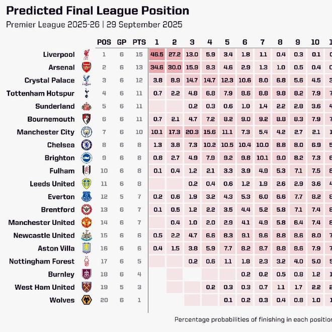 雷速体育9月29日讯 新赛季英超联赛进行到第6轮,国外数据机构使用超级计算机更新了对本赛季最终积分榜的预测,利物浦仍以46.5%的夺冠率位居第一。