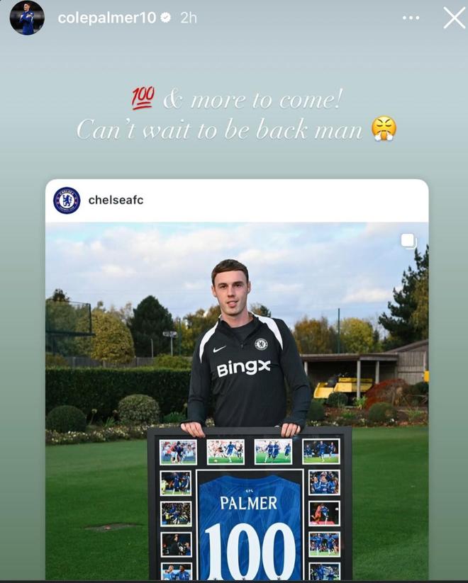 日前,切尔西向达成蓝军生涯百场里程碑的球员赠送了纪念礼物,其中包括帕尔默,他在社媒晒出了照片,并表示自己已经迫不及待想回归了。