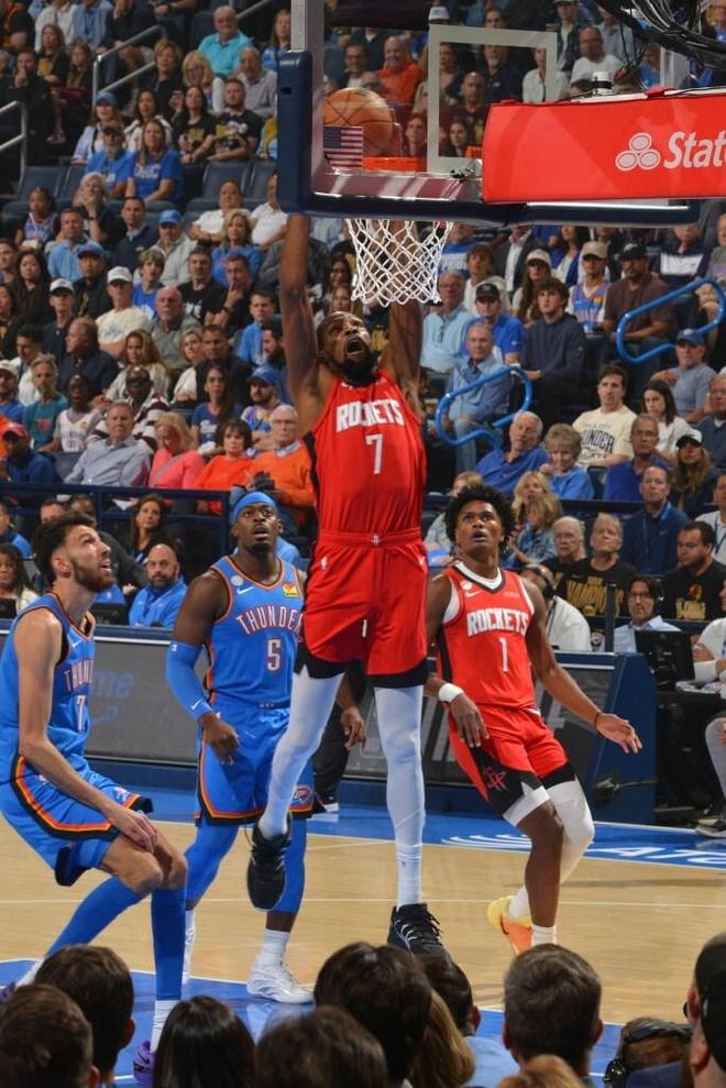 揭幕战,火箭队经过双加时以124-125不敌卫冕冠军雷霆队。杜兰特此役贡献23分、9个篮板和3次助攻,却在全场观众的欢呼声中六犯离场。